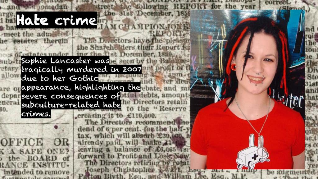 - Hate Crimes – The murder of Sophie Lancaster in 2007, due to her gothic appearance, underscores the very real dangers of being different.