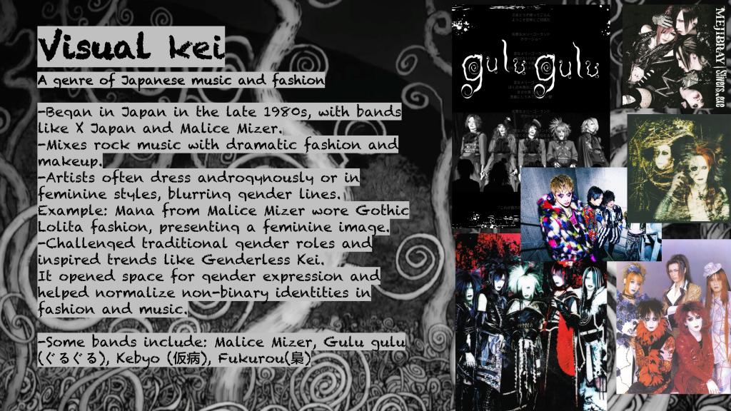 - Visual Kei – Emerging in the 1980s, Visual Kei blends gender expression and theatricality in music and dress. Icons like Mana (Malice Mizer) blurred gender lines and redefined performance and identity.